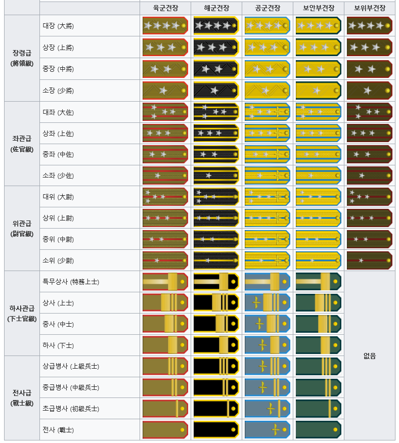 - 상등병사, 중급병사, 초급병사, 전사: 입대 후 일정 기간 복무함에 따라 자동적으로 상위 병사 계급으로 승급합니다. 일반적으로 ‘전사’가 입대 직후 계급입니다.